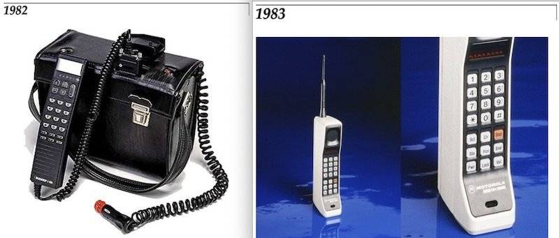 這臺機器是全球的第一臺真正的手機,這也是全球第一次“真正的手機通話”——當時歐美國家雖然有移動電話,但全像臺式電腦一樣笨重(下圖左)。10 年后,這臺名叫 DynaTAC 的手機(下圖右)正式上市,這也是第一代的移動通訊系統——1G 制式的正式登場。